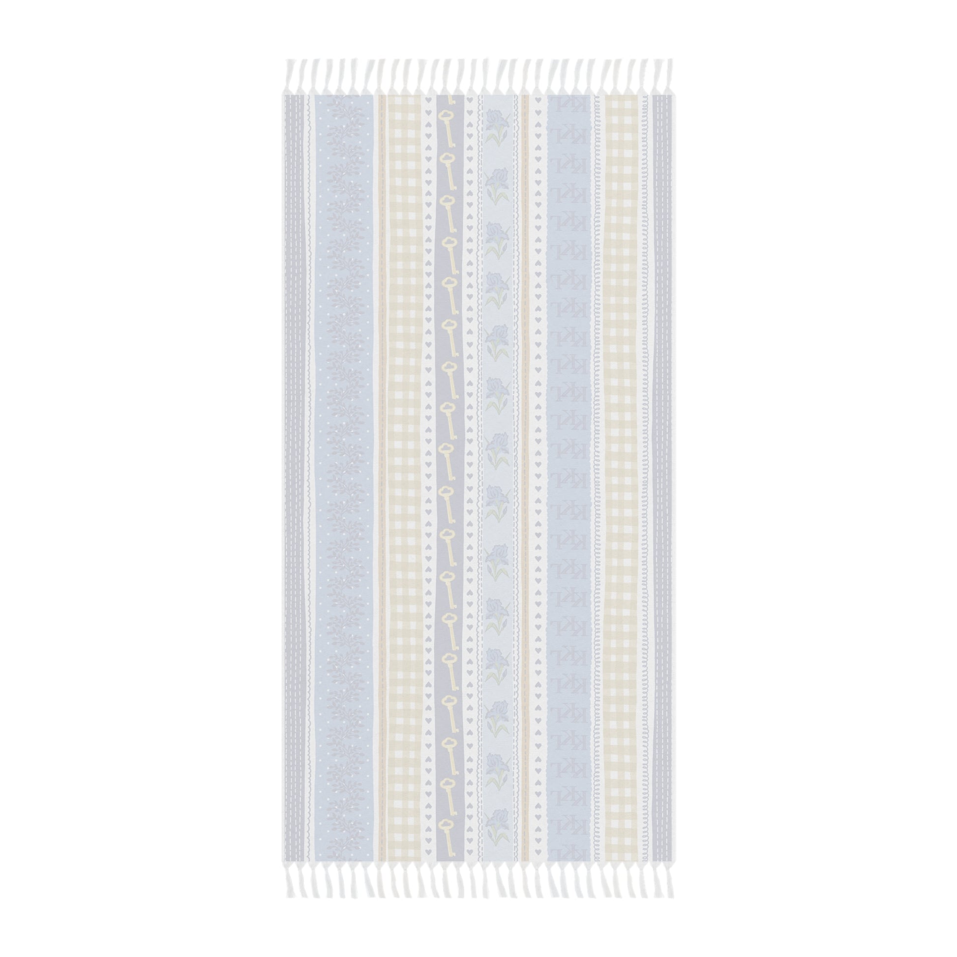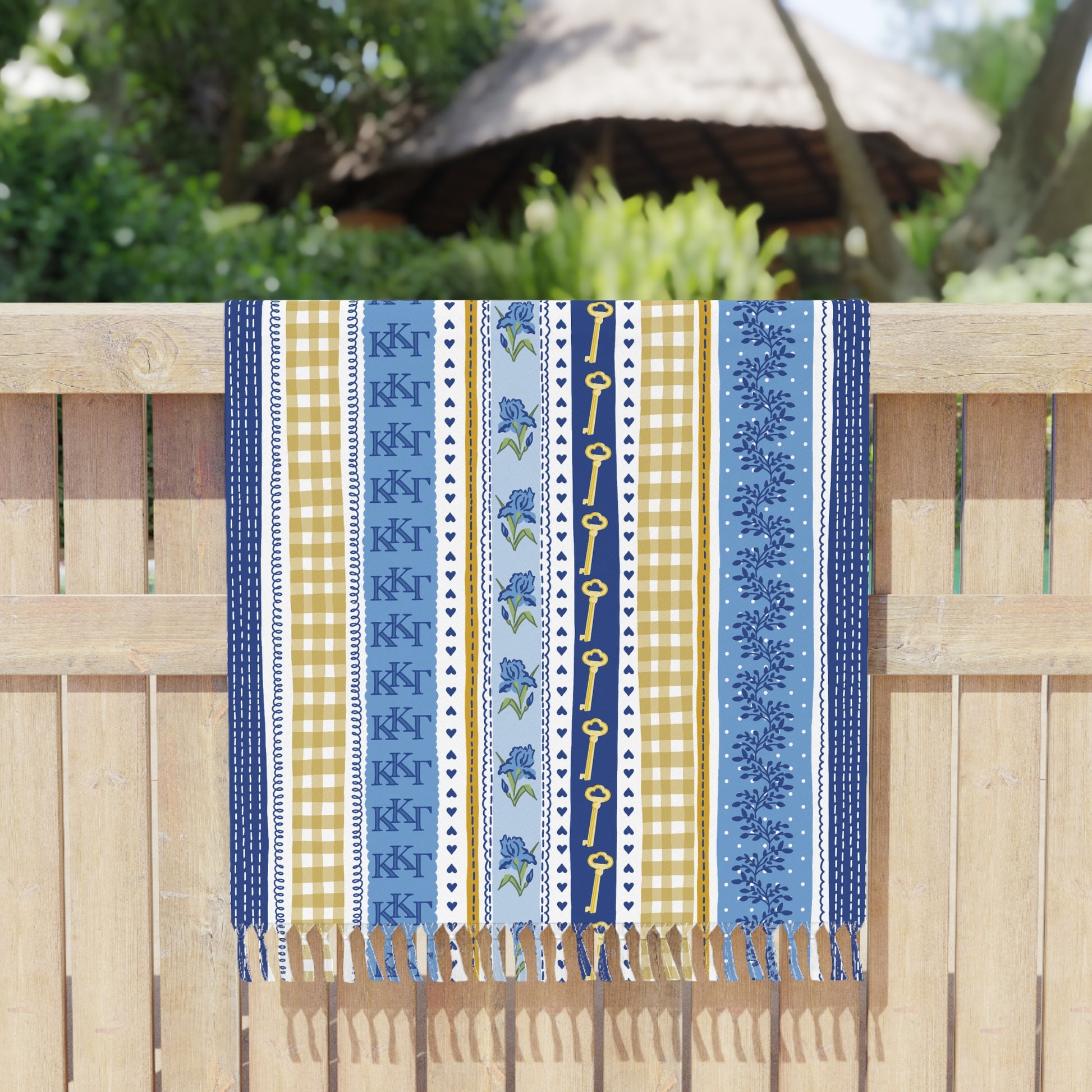 Stay stylish at the beach or pool with this Kappa Kappa Gamma beach towel, featuring a striped patchwork design with ΚΚΓ letters, keys, irises, hearts, and plaid patterns in dark blue, light blue, and gold—perfect for showing your Kappa pride on sunny days. Large and absorbent, it's a practical essential for sorority girls who love combining function with sisterhood spirit.