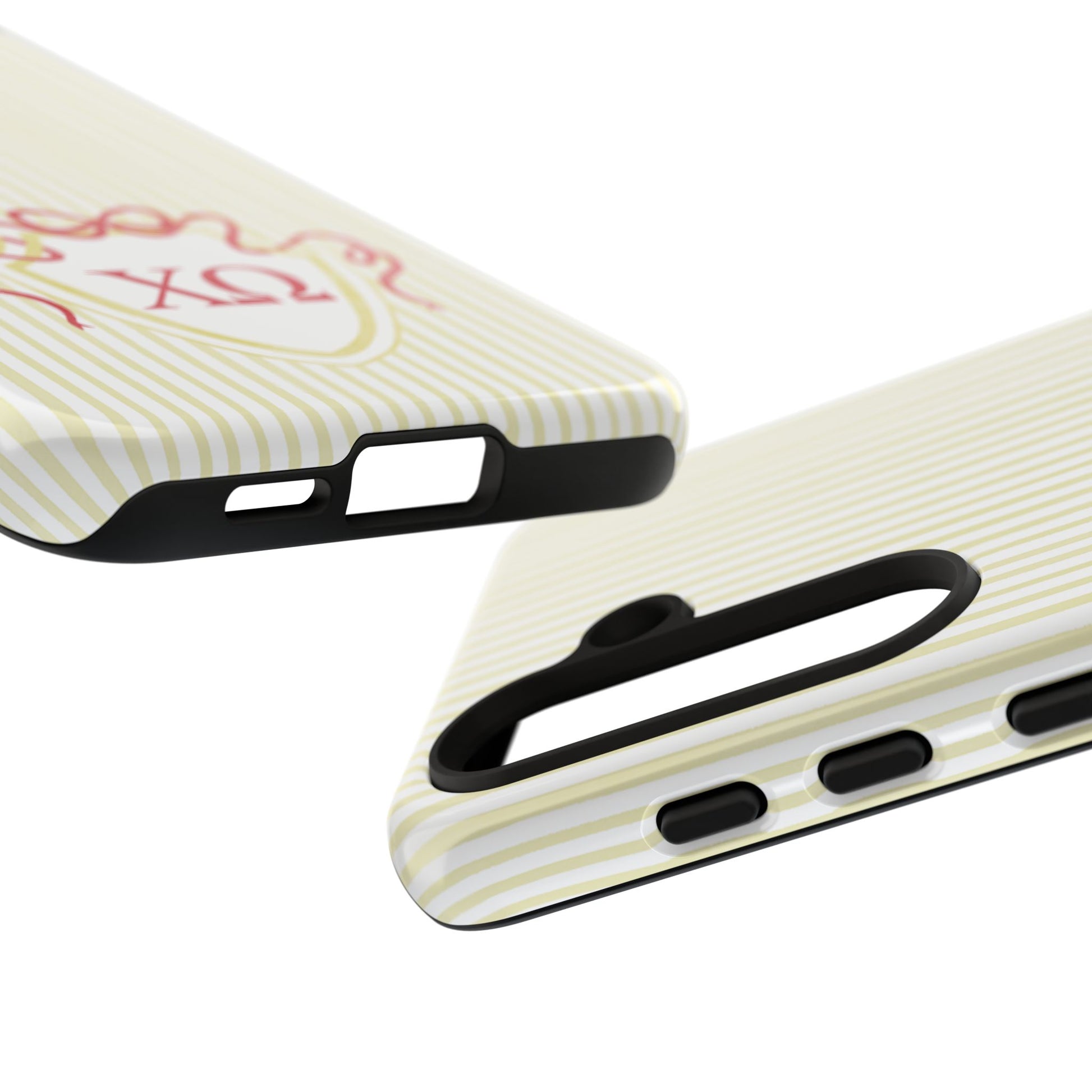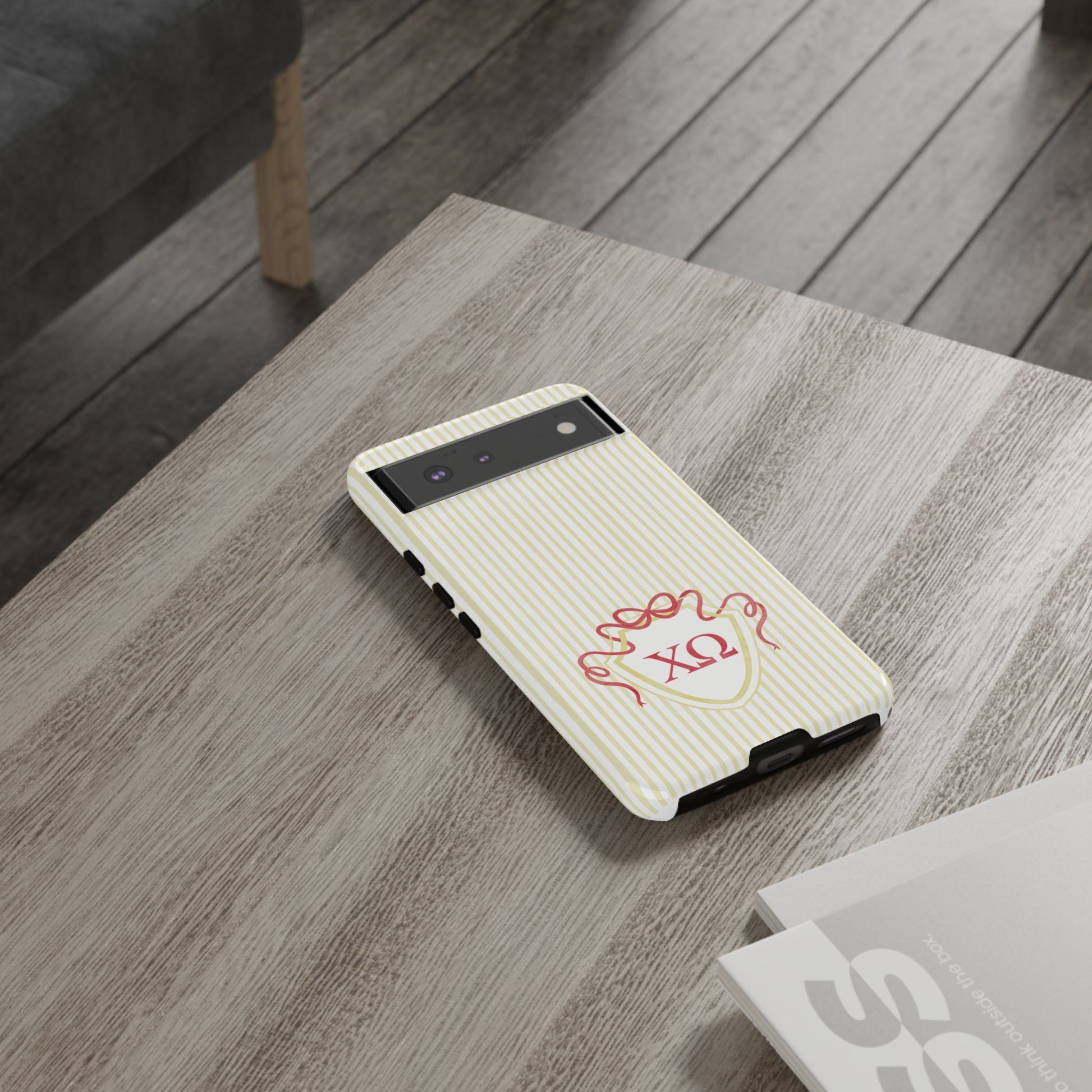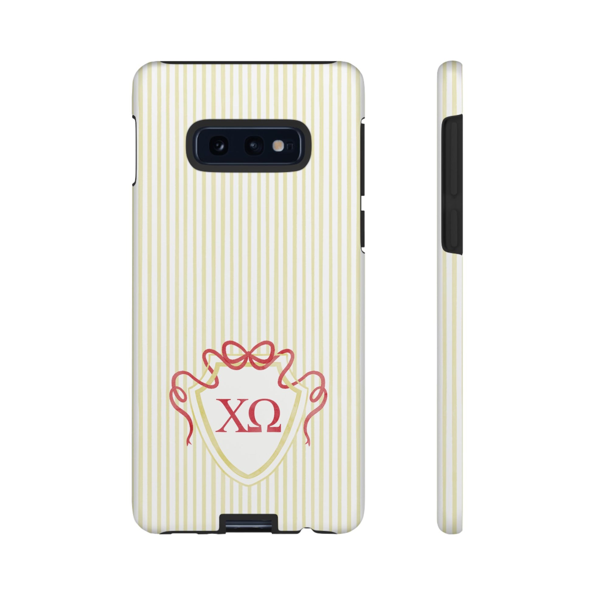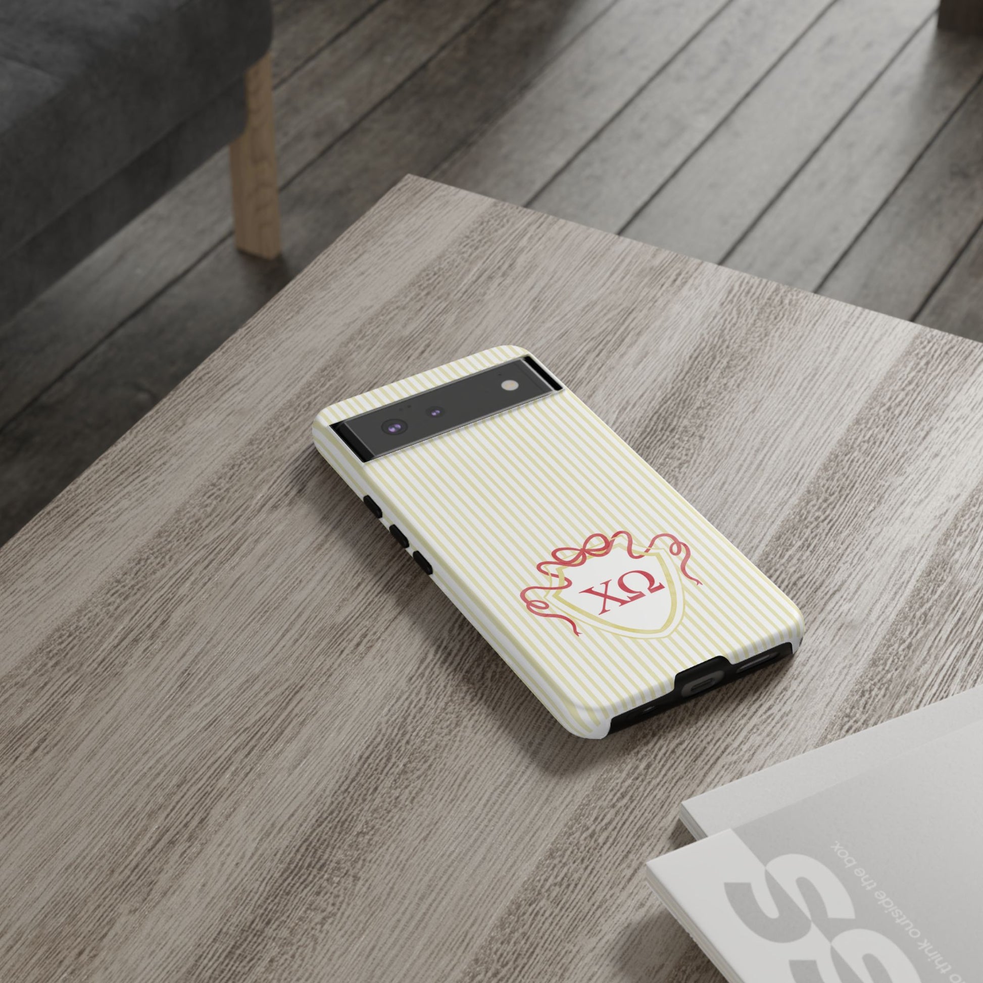 Show off your Chi Omega pride with this charming Android case, featuring a cardinal red and white seersucker stripe pattern and the sorority's iconic crest adorned with a delicate gold bow—perfect for protecting your phone in true Southern style. Designed with a sleek, durable construction, this case combines classic charm with reliable functionality, making it an essential accessory for actives and alumnae who love celebrating their Chi Omega sisterhood.