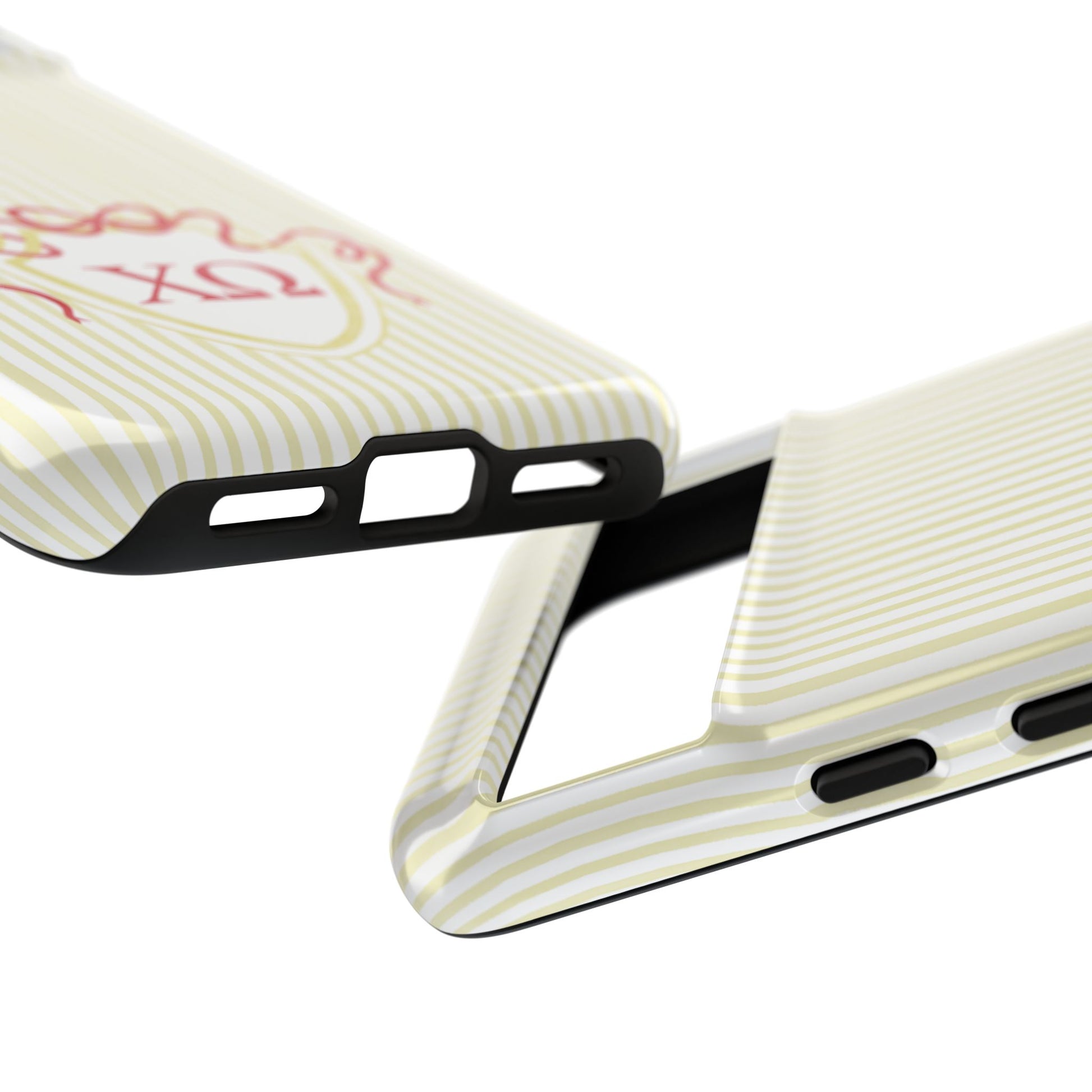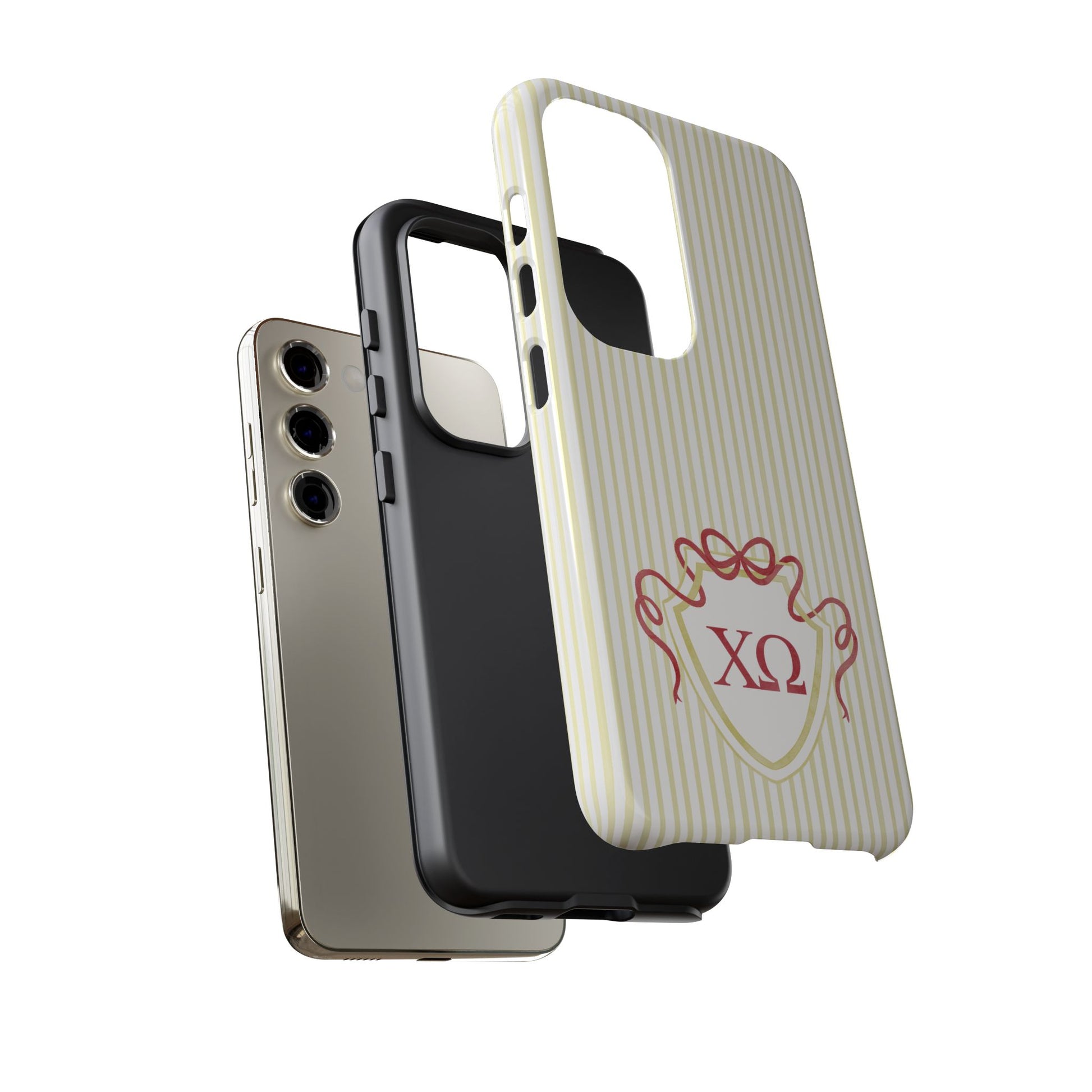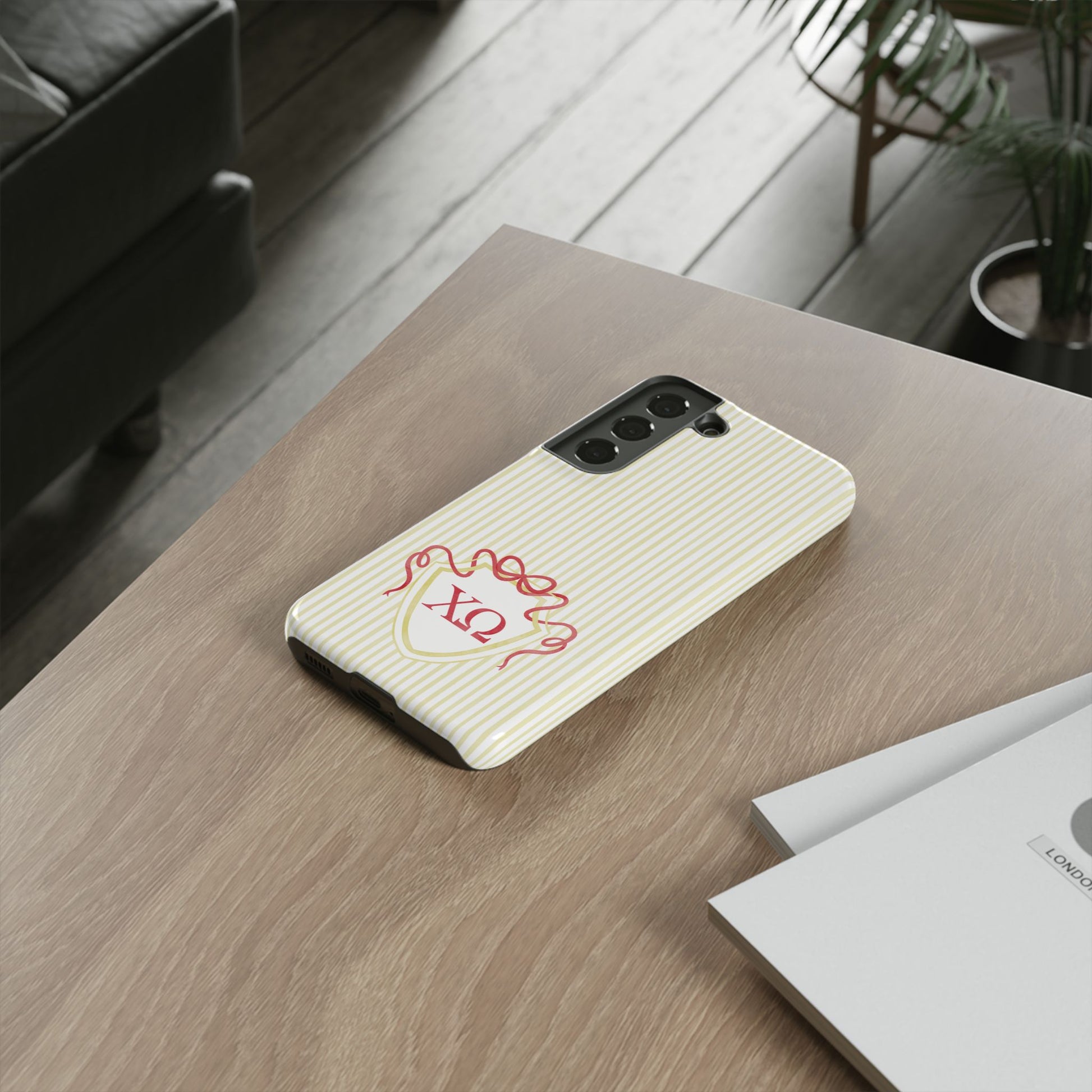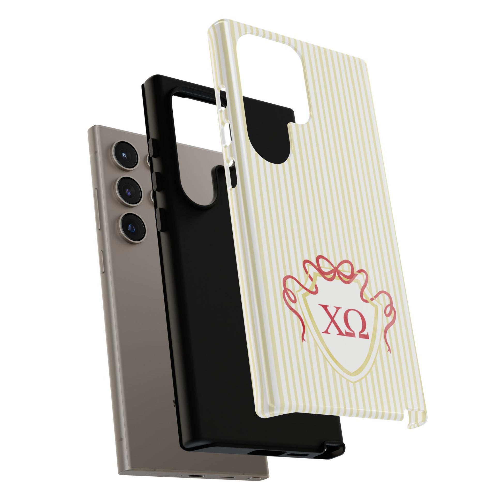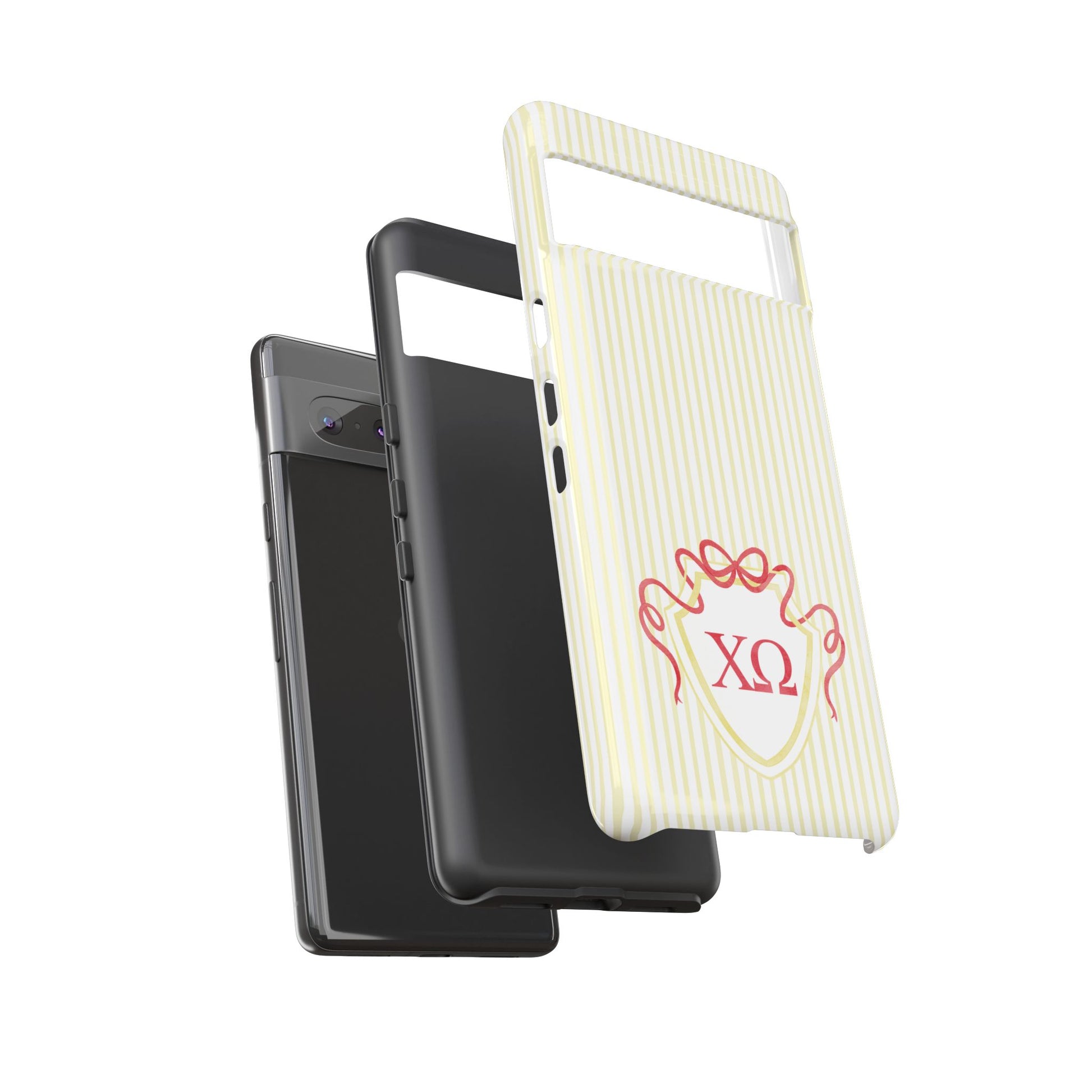 Show off your Chi Omega pride with this charming Android case, featuring a cardinal red and white seersucker stripe pattern and the sorority's iconic crest adorned with a delicate gold bow—perfect for protecting your phone in true Southern style. Designed with a sleek, durable construction, this case combines classic charm with reliable functionality, making it an essential accessory for actives and alumnae who love celebrating their Chi Omega sisterhood.