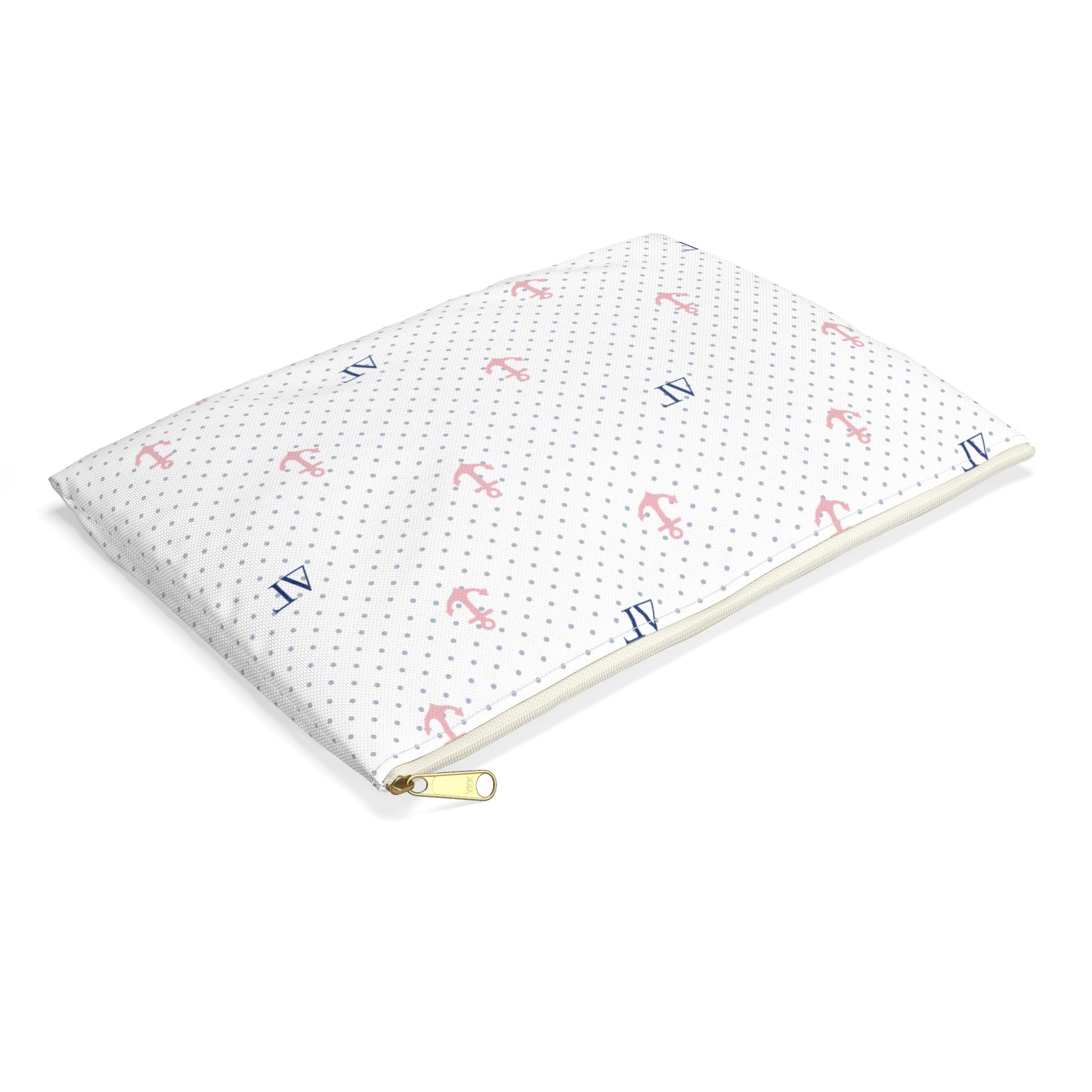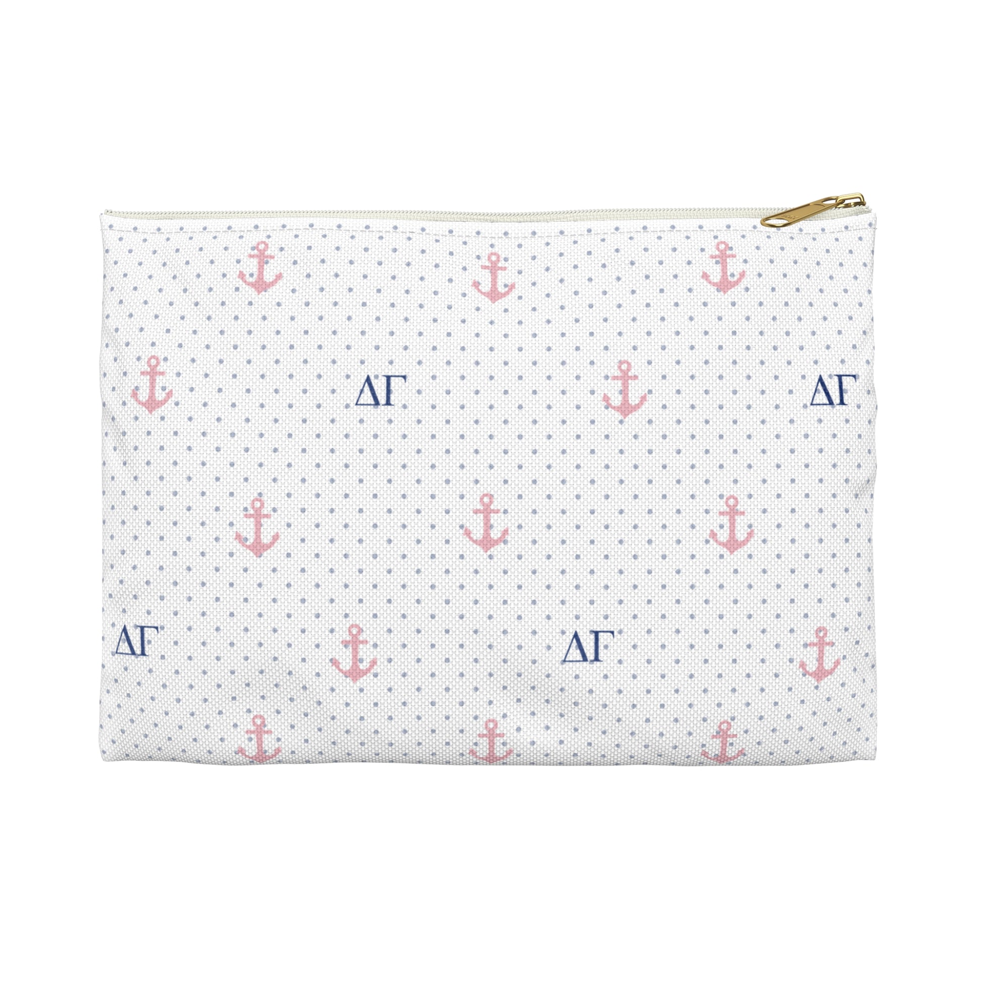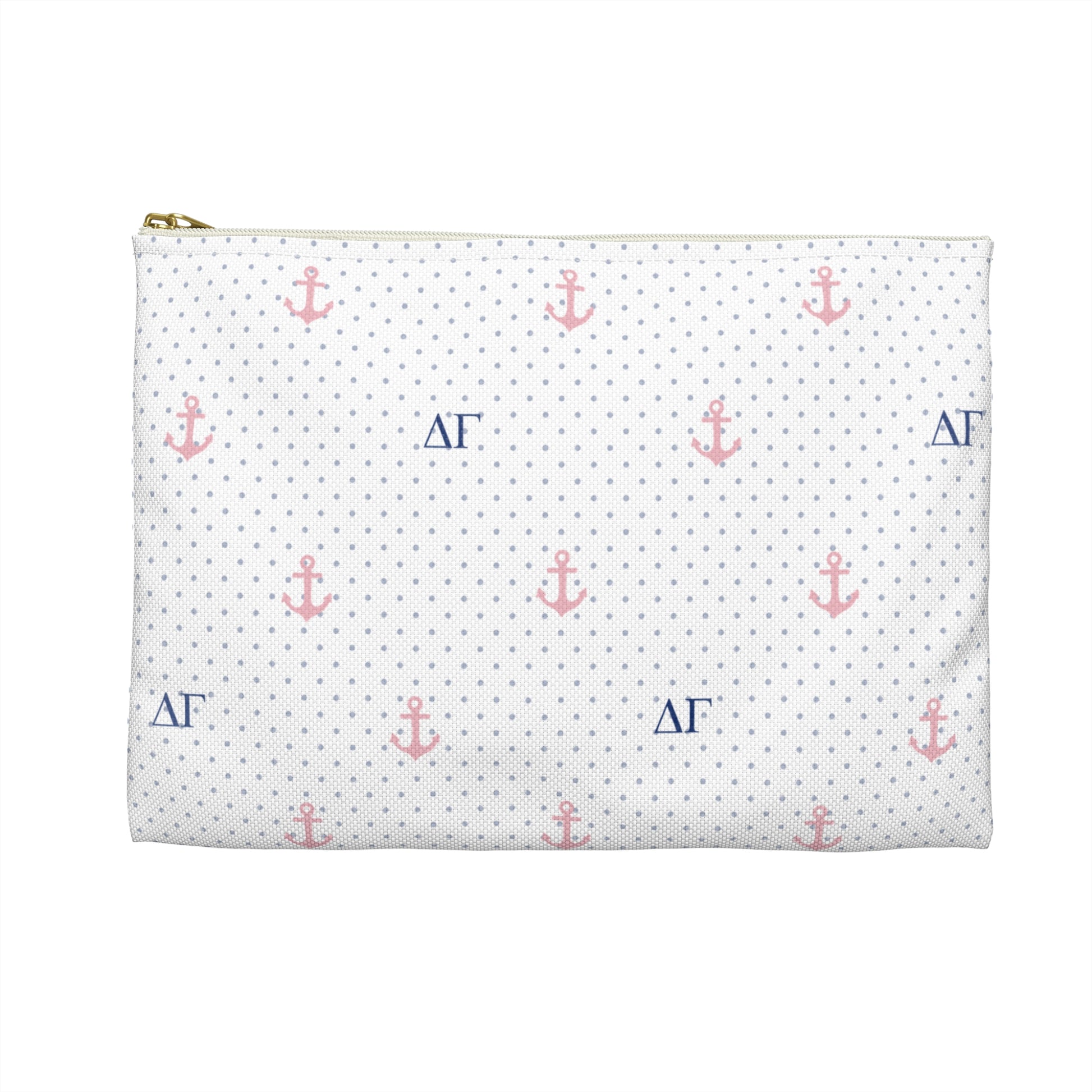 Keep your essentials organized with this Delta Gamma cosmetic bag, featuring a classic navy polka dot pattern with scattered ΔΓ letters and pink anchor accents—perfect for showing your ΔΓ pride on the go. Durable and practical, it's a must-have accessory for sorority girls who want style and function in one bag.