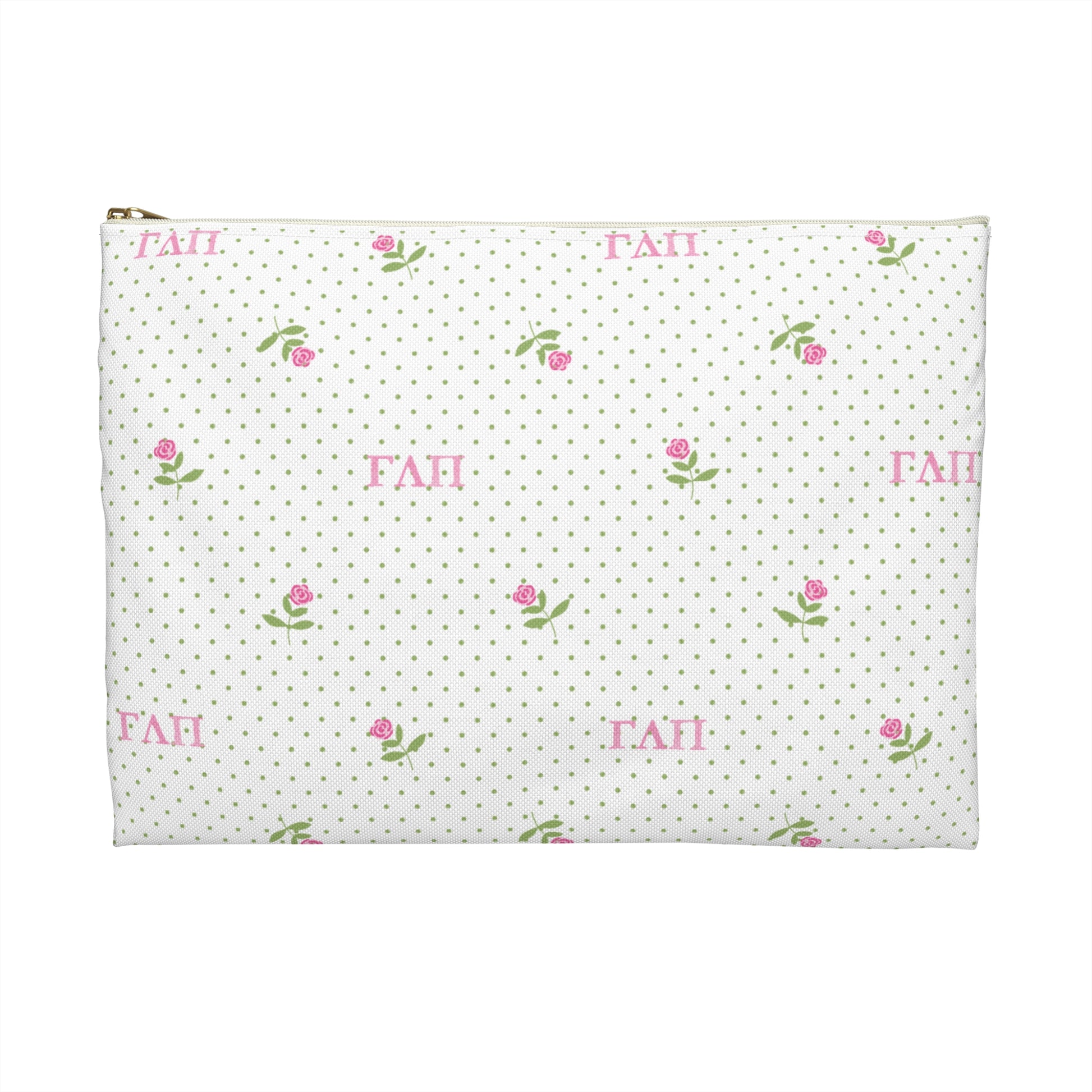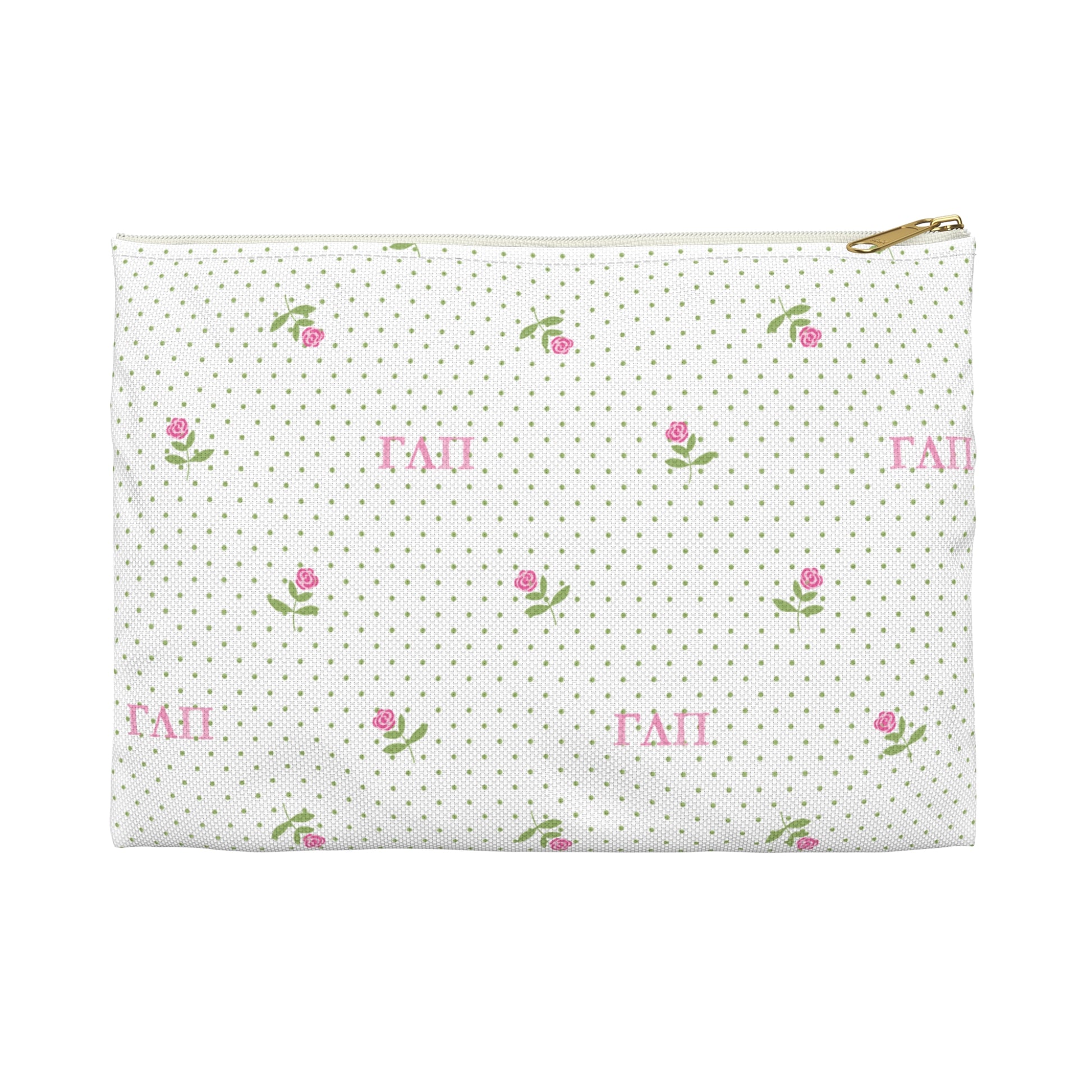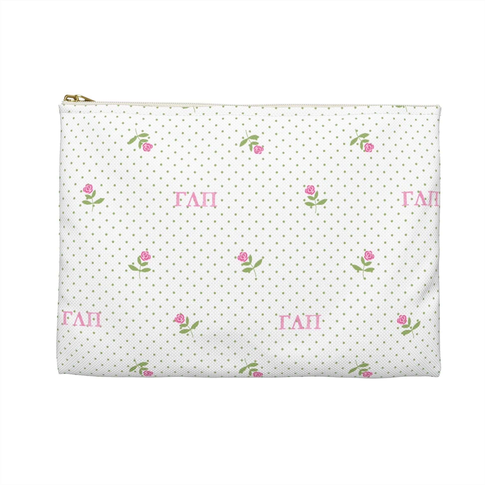 Canvas bag with your letters, polka-dots, and sorority flowers. Big enough for the full glitter emergency kit, cute enough to leave out on the sink.