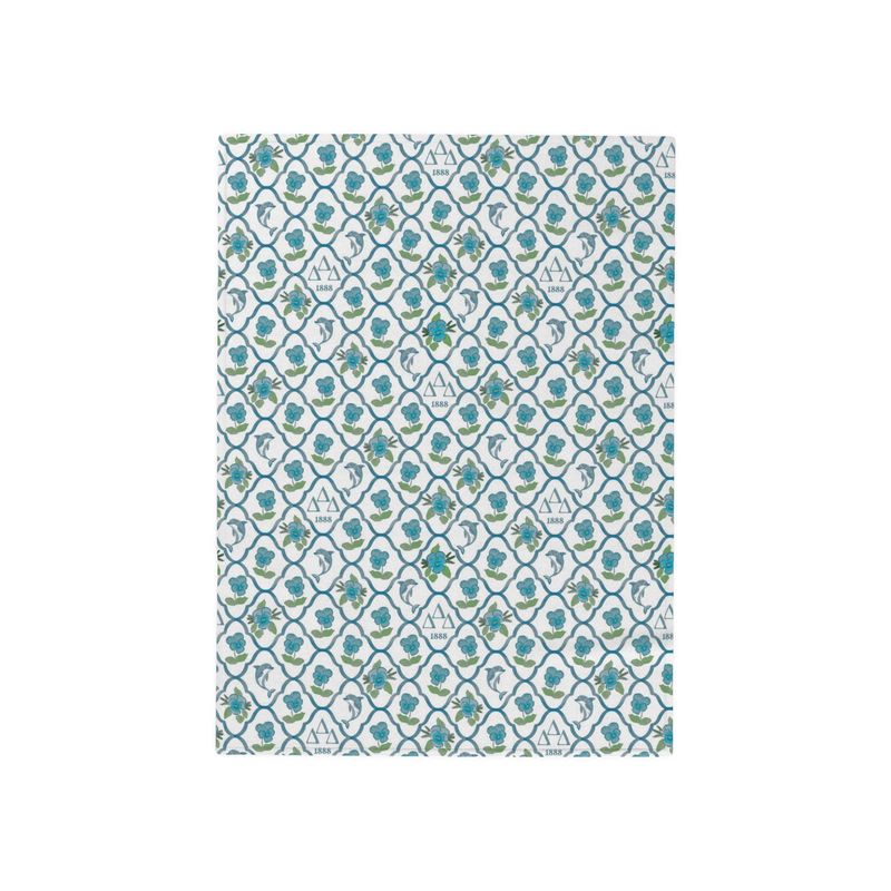 Wrap up in Delta Delta Delta pride with this tailgate throw blanket featuring a classic blue lattice design, with ΔΔΔ letters, pansies, and dolphins throughout the pattern. The lattice design is on the front; the reverse is a solid blue.Constructed with 16.8oz double-thick material from two layers of 100% poly fleece, it's soft, anti-piling, and fire-rated for safety. The water-repellent fabric works well for tailgates, game days, dorm use, or chapter events.Perfect for game day tailgates, big/little gifts, or dorm decor.