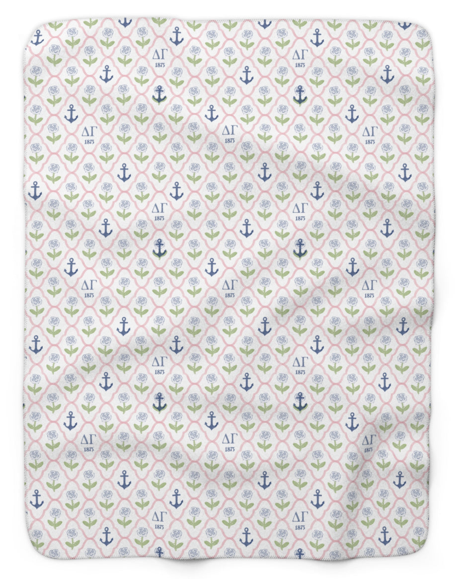 Wrap up in ΔΓ pride with this tailgate throw blanket featuring a classic navy and cream design with repeating ΔΓ letters, golden anchors, and delicate cream colored roses throughout the pattern.
