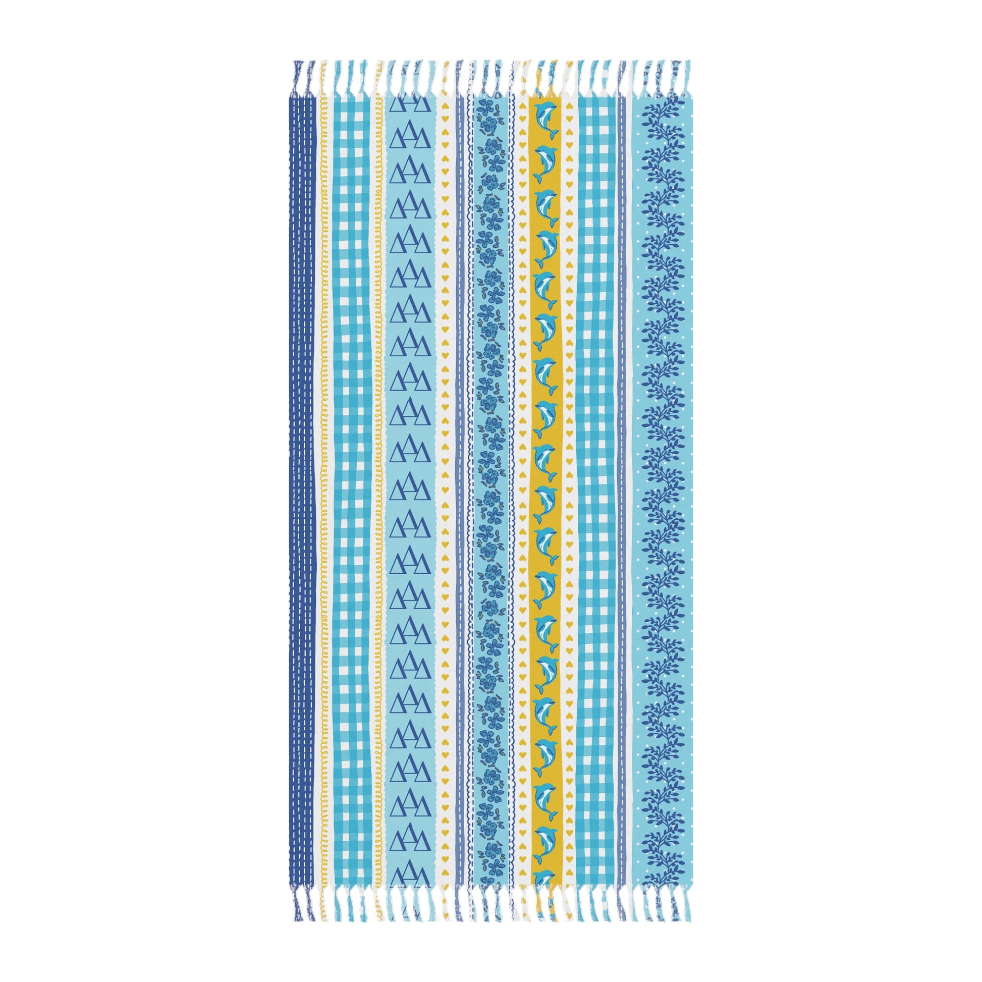 Stay stylish at the beach or pool with this Delta Delta Delta beach towel, featuring a striped patchwork design with Tri Delt letters, dolphins, pansies, hearts, and plaid patterns in blue, gold, and purple—perfect for showing your Tri Delta pride on sunny days. Large and absorbent, it's a practical essential for sorority girls who love combining function with sisterhood spirit.